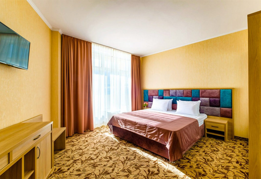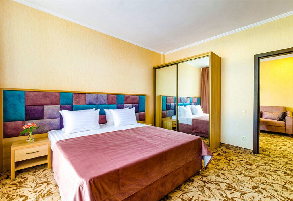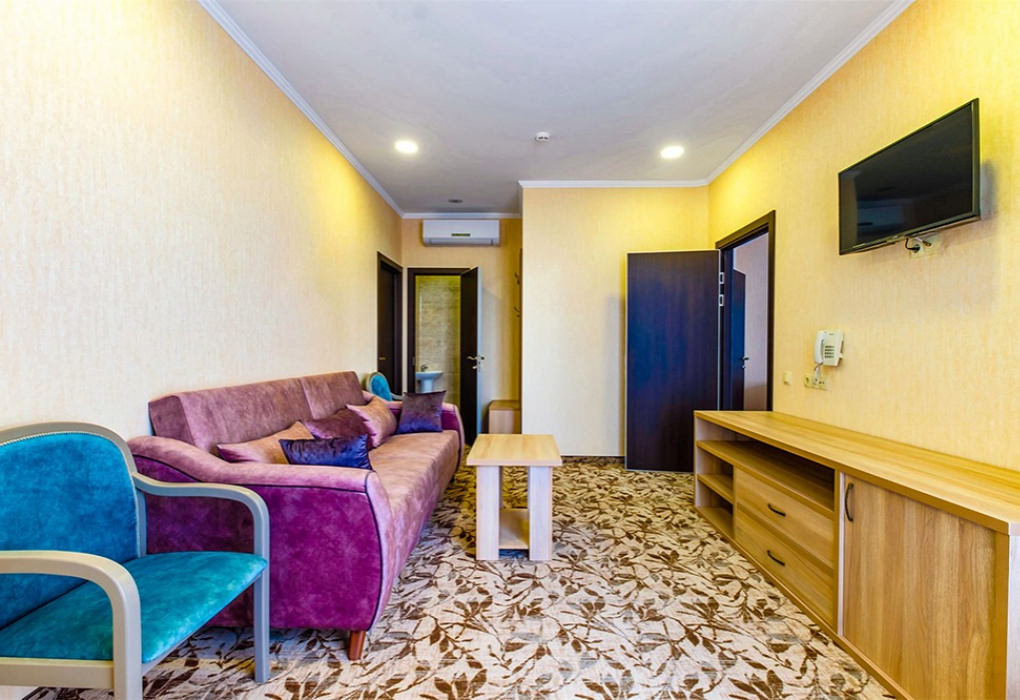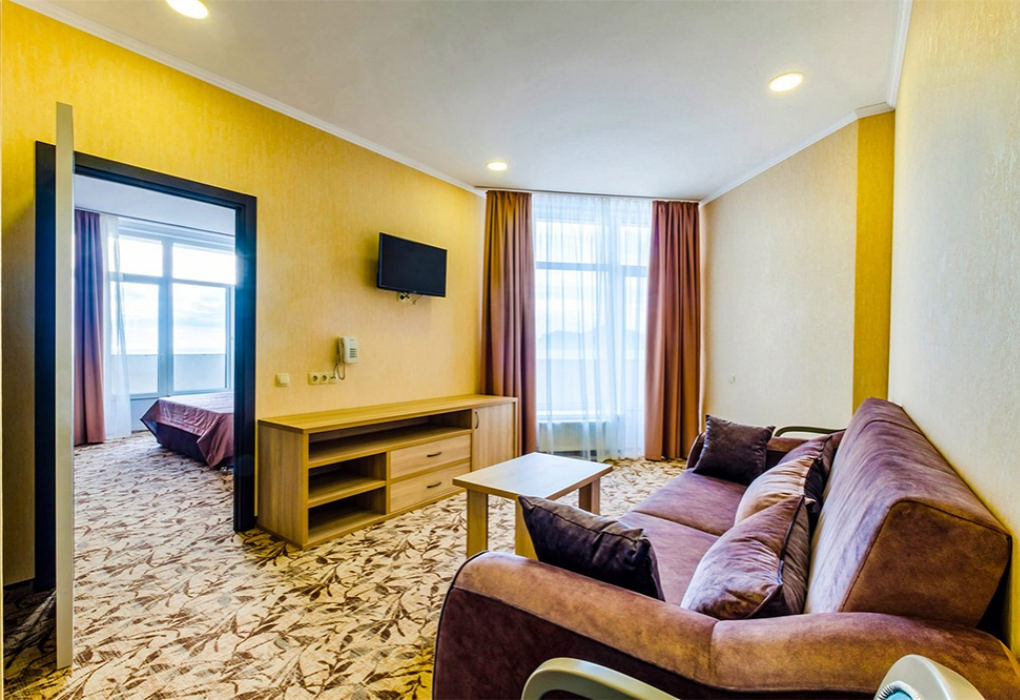 Площадь номера - 58 кв.м. 3 комнаты. 4 осн. места. боковой вид на море. В номере: телевизор; холодильник; балкон; кондиционер; телефон; фен; туалетные принадлежности; мебель на балконе; стул; 2-спальная кровать; 1-спальные кровати; прикроватные тумбочки; кресло; зеркало; вешалка для одежды; душевая кабина; шкаф; багажница; санузел; мини-сейф; электрический полотенцесушитель. 1 доп. место: Диван - может быть предоставлен без ограничения по возрасту.